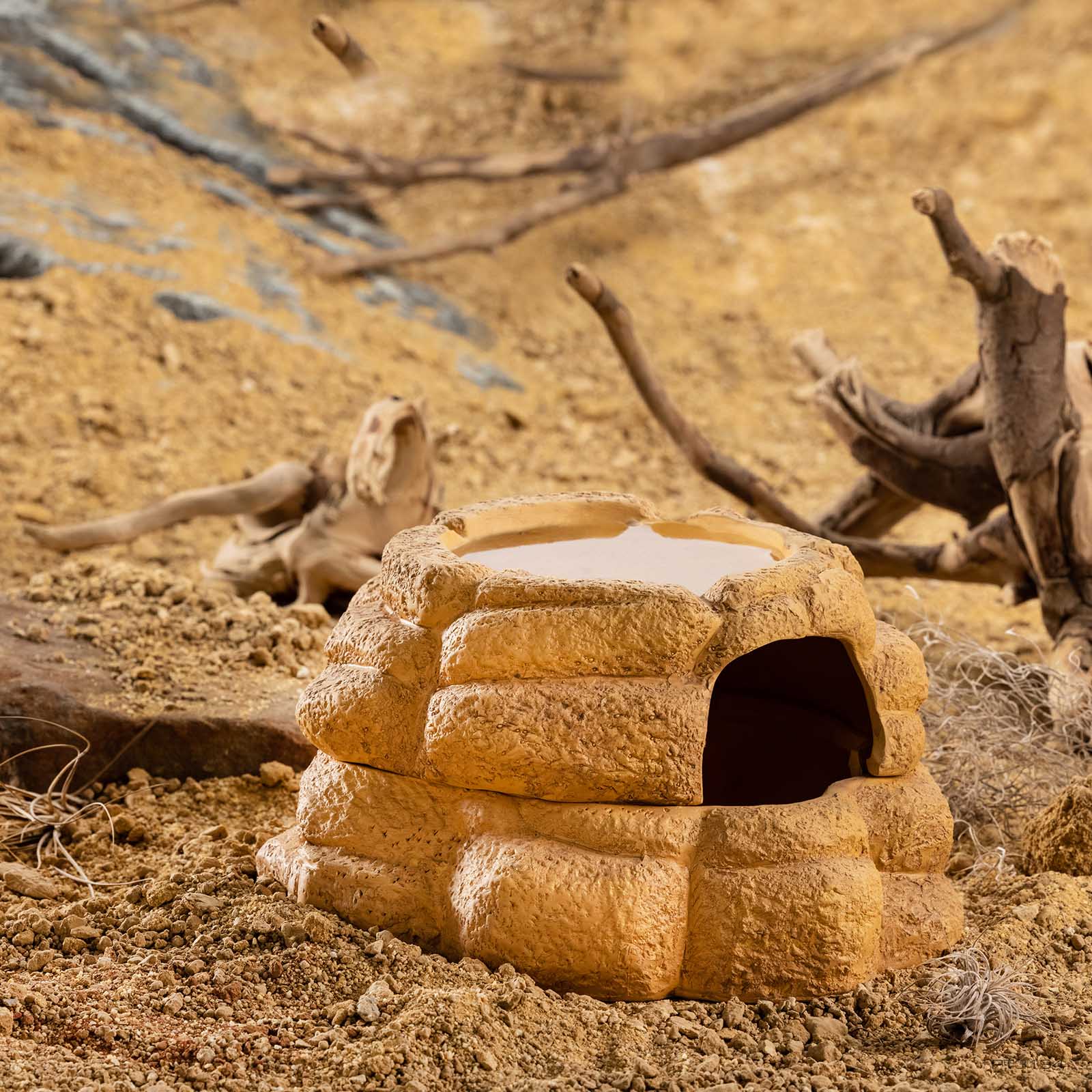 Dank der hygroskopischen Eigenschaften des Keramikmaterials absorbiert die Höhle Feuchtigkeit aus dem integrierten Wasserreservoir und gibt sie langsam wieder ab. So entsteht ein stabiles Mikroklima mit gleichmäßiger Temperatur und Luftfeuchtigkeit, das die Thermoregulation, Flüssigkeitsaufnahme und Häutung unterstützt. Zusätzlich trägt es zur Vorbeugung von Atemwegsinfektionen bei.