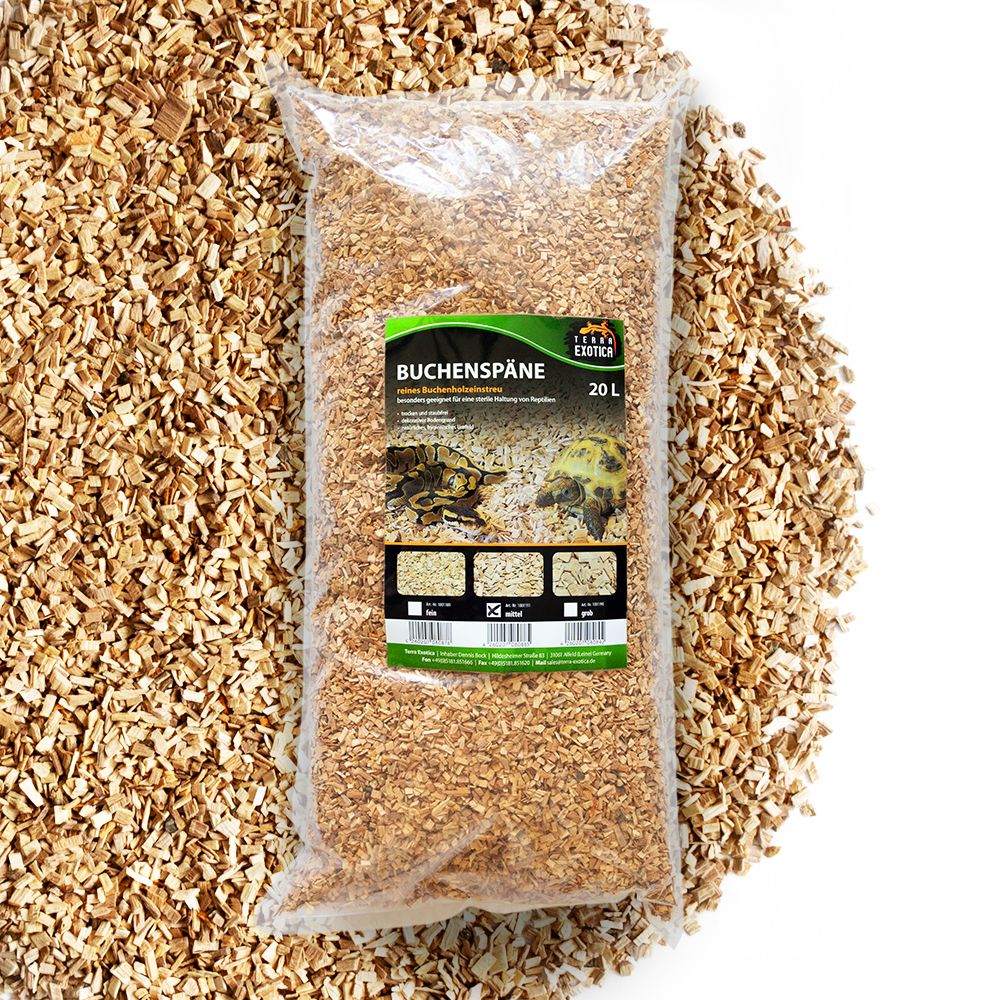 Die Buchenspäne in mittlerer Körnung (3–5 mm) sind ein 100 % natürliches Substrat und ideal als dekorativer Bodengrund für Terrarien, Vögel und einige Kleintierarten. Mit einem Volumen von 20 Litern eignet sich dieses Naturprodukt besonders für Schlangen und größere Echsen, die keine hohe Feuchtigkeit benötigen, sowie für eine sterile und hygienische Haltung.