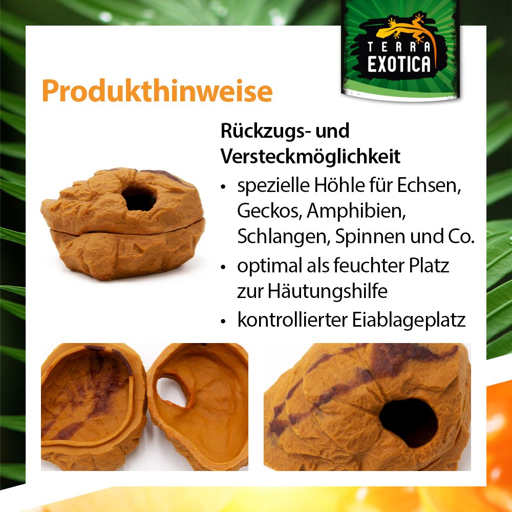 Die Höhle besteht aus robustem Material in naturgetreuer Steinoptik und ist mit einem abnehmbaren Deckel ausgestattet. So kann sie leicht gereinigt oder kontrolliert werden. Mit feuchtem Moos gefüllt, entsteht ein ideales Mikroklima, das Häutung und Eiablage unterstützt.
